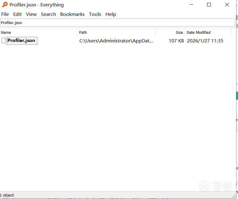 使用 Everything 工具,追踪到了其释放的一个关键文件:Profiler.json,路径位于 C:\Users\Administrator\AppData\Local。