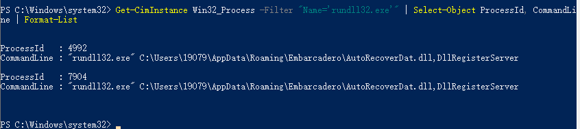 判定标准: 观察输出结果中的 CommandLine 字段,找到路径包含 C:\Users\...\AppData\Roaming\Embarcadero\AutoRecoverDat.dll,DllRegisterServer 的进程,记录其 ProcessId。