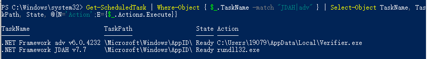Get-ScheduledTask | Where-Object { $_.TaskName -match "JDAH|adv" } | Select-Object TaskName, TaskPath, State, @{N='Action';E={$_.Actions.Execute}}