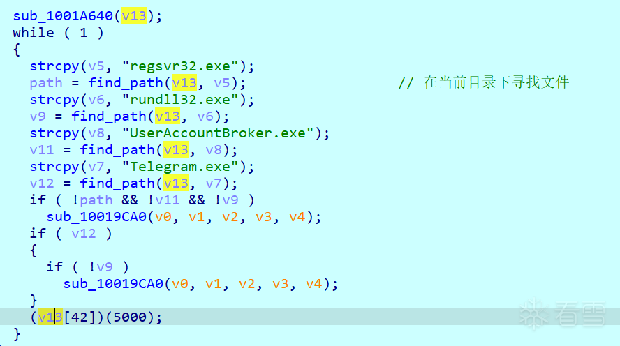 三阶段(UserAccountBroker): 代码会检查当前目录下是否存在特定的 EXE 文件。如果 regsvr32、rundll32 等为空,则触发 sub_10019CA0 函数进入三阶段: