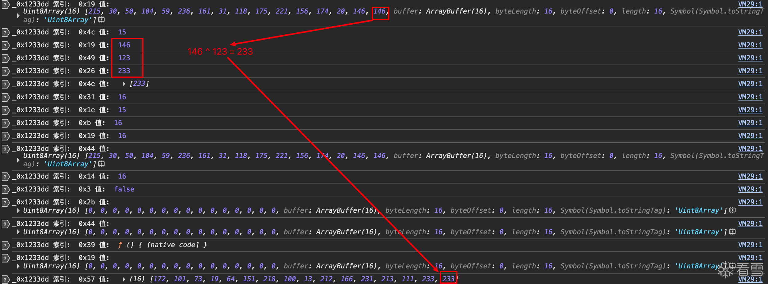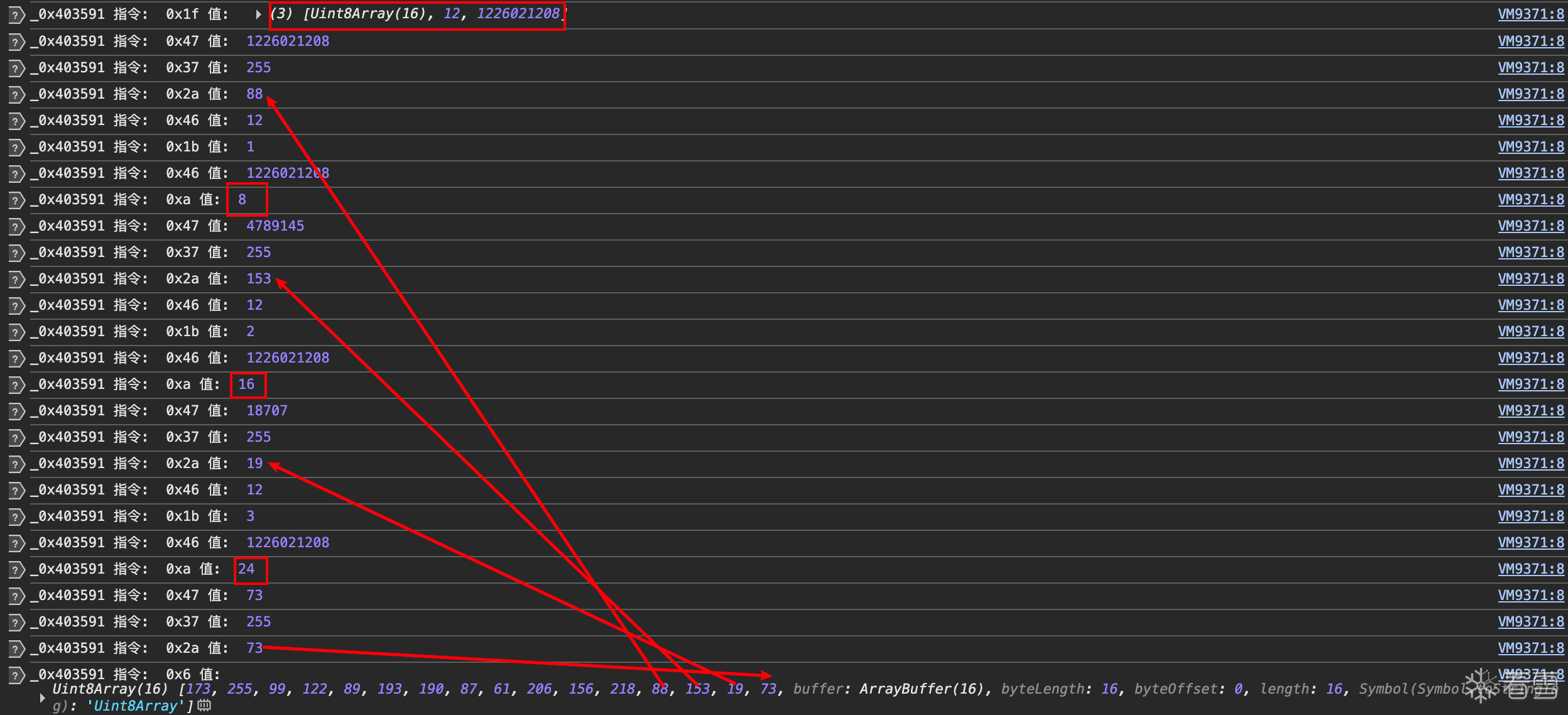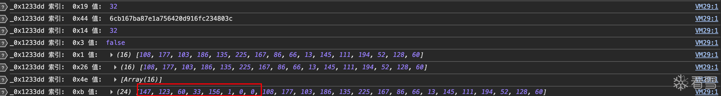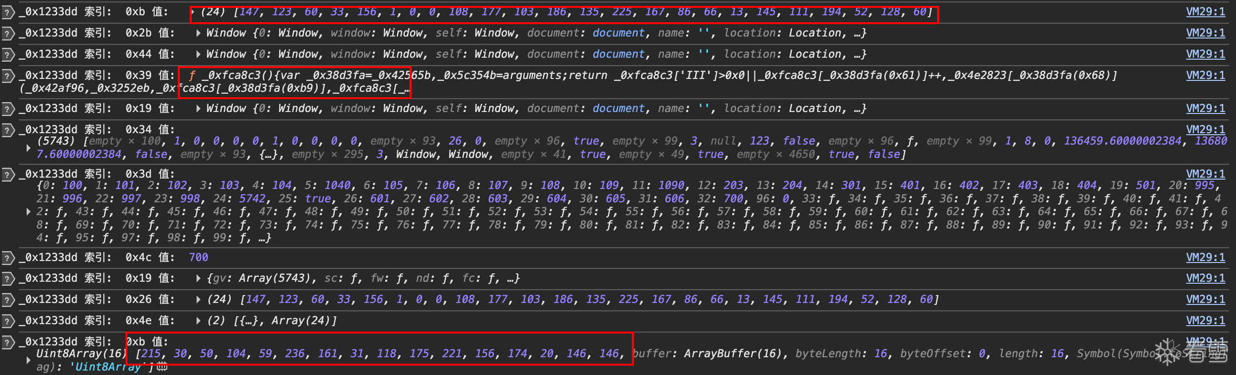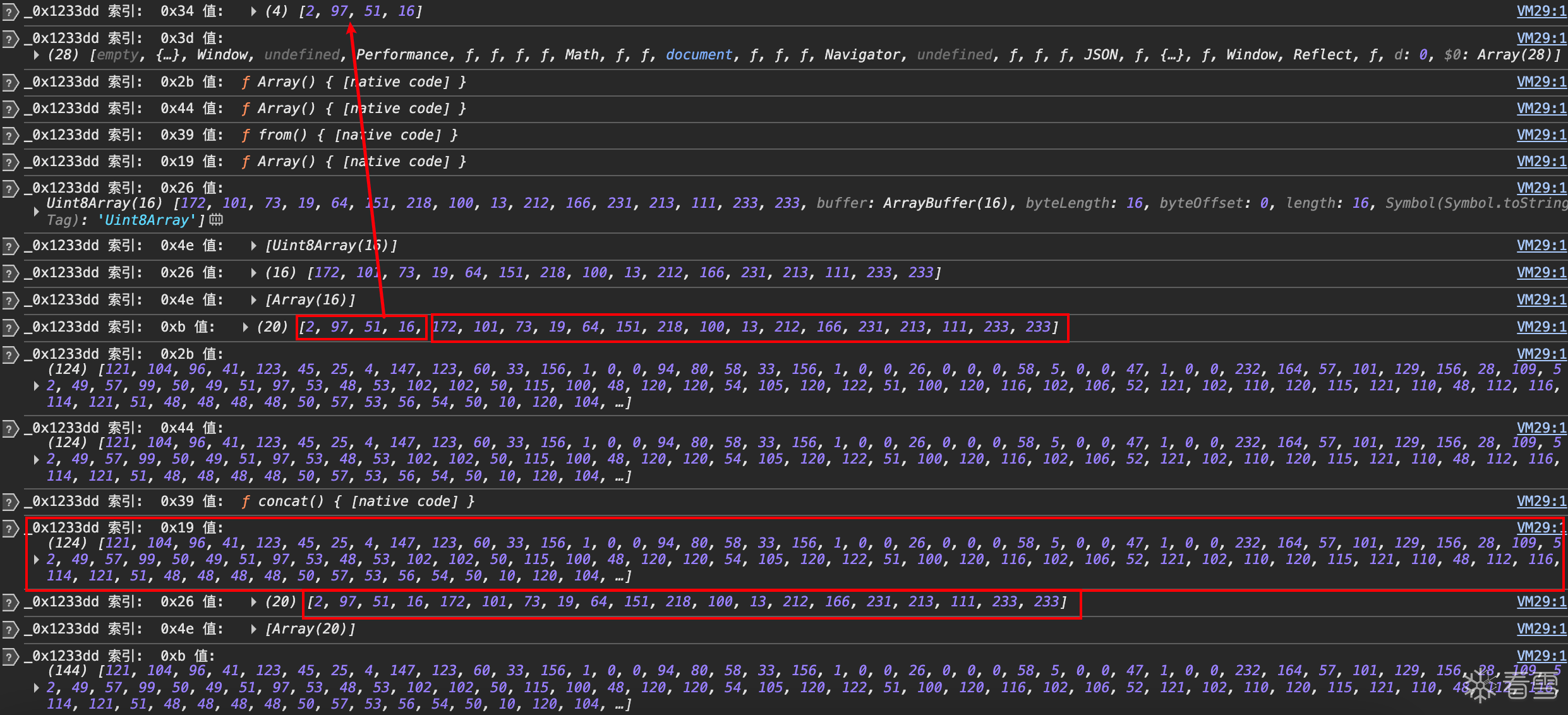 可以看到一个24位数组,然后是一个_0xfca8c3方法,然后就出现了16位数组,那么大概率这个16位数组就是有_0xfca8c3方法生成的,入参很可能就是这个24位数组