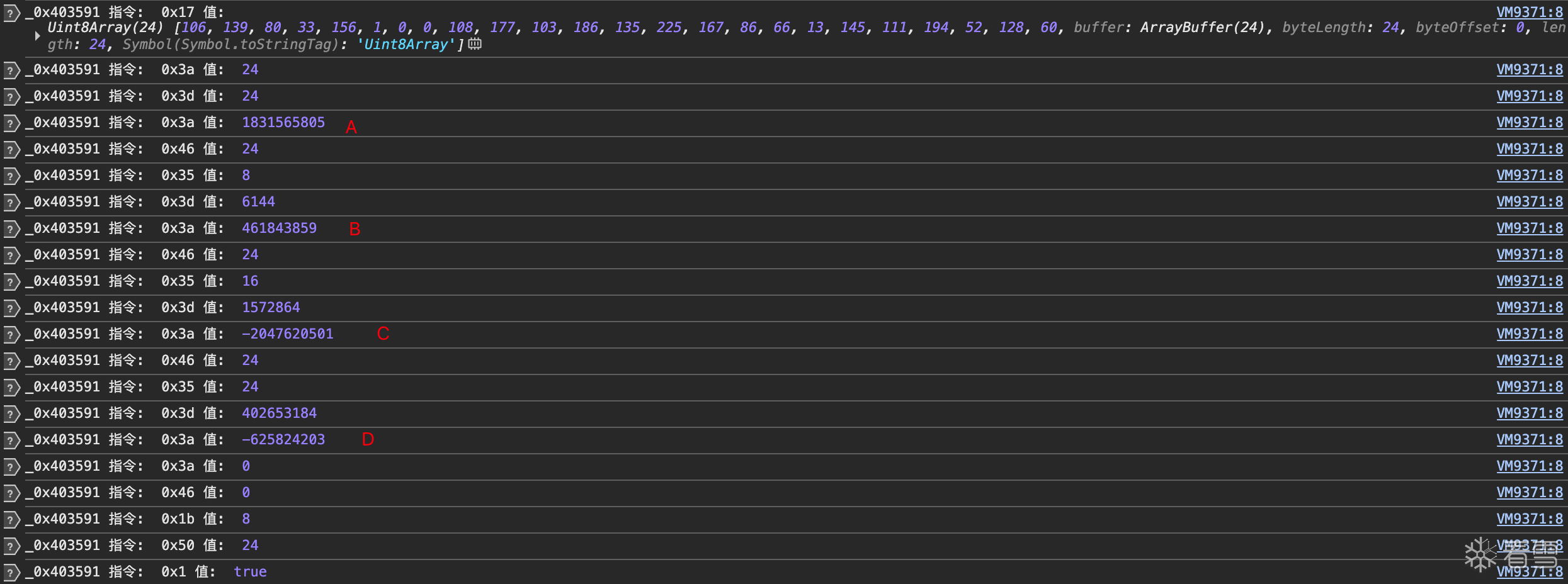 我们继续看日志,跟过之前md5的方案的同学应该不陌生,将一个无符号整数变成4个字节,同理可以找到另外3个无符号整数。