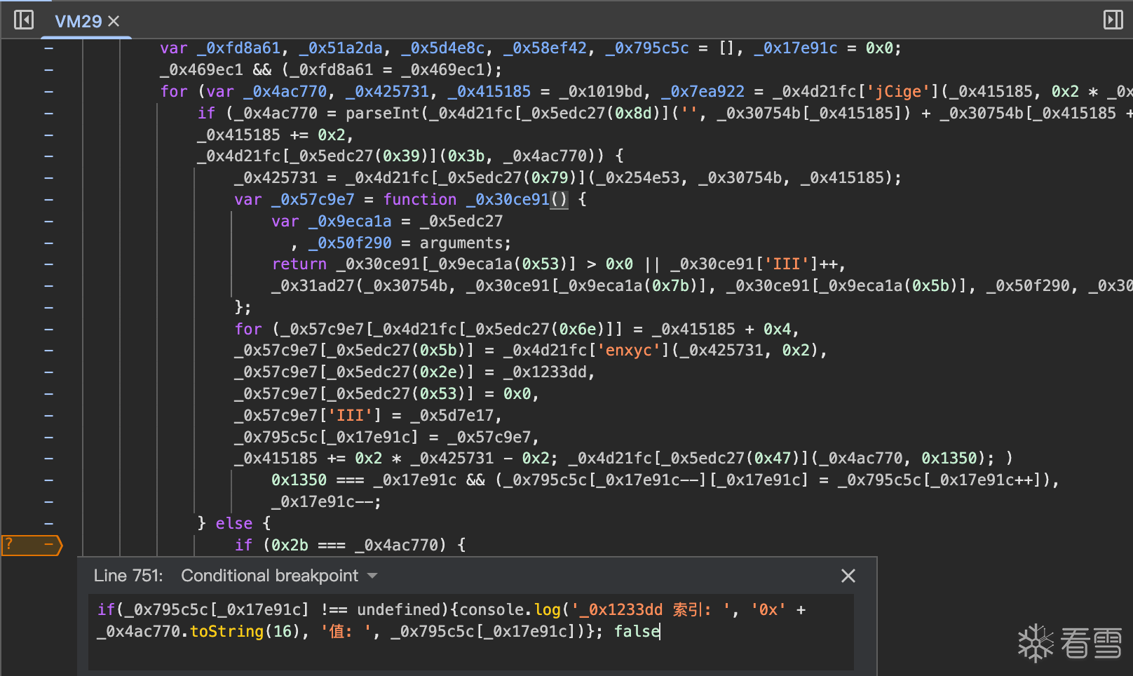那么我们进入_0xfca8c3方法,没错,又是一个vmp,继续根据惯例在这个巨大的for循环里打上断点(ps: 当你的断点没生效时,可能是此时的vmp已经变了,根据日志重新进入新的vmp中)。