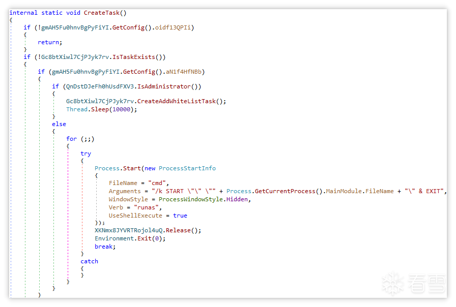 检查是否存在计划任务与管理员权限:检测当前进程文件所在目录是否为.NET运行时目录C:\Windows\Microsoft.NET\Framework64\v4.0.30319,如果不是则继续查看是否存在名为NextChannelSink的计划任务,再检测是否为管理员权限,若不是管理员则会利用管理员启动CMD执行当前进程文件。随后创建两个计划任务,分别为添加Windows Defender排除项和创建反复执行NextChannelSink.exe文件的计划任务。