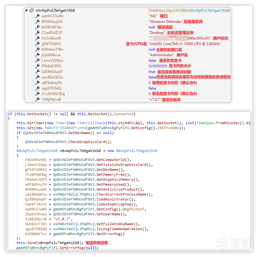 发送系统信息:随后连接远程服务器并发送受害者的系统信息,其中包括反病毒软件、错误消息、主机类型、用户标识、显卡/CPU名与显卡内存大小信息等信息,其中比较特别的是会获取全屏时的窗口名和"v7.0.7"这个类似于版本的字符串数据。