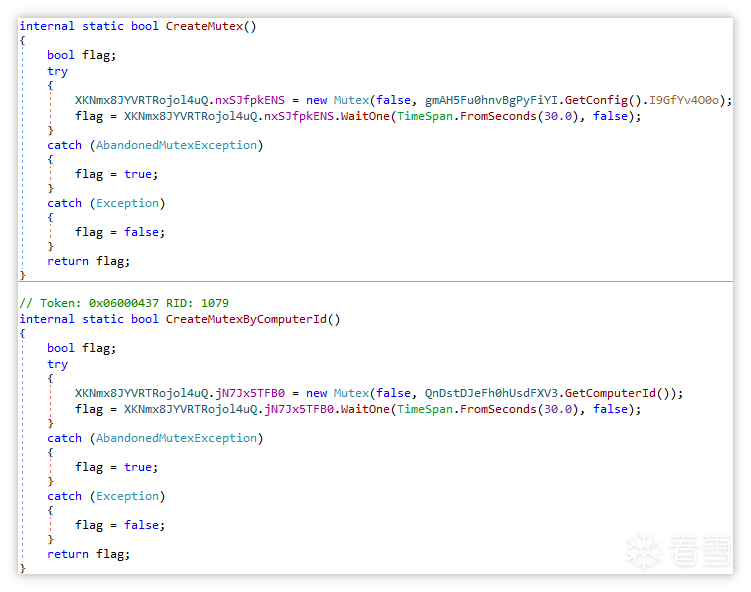 创建两个互斥体:第一次是通过配置中的互斥体名0e408d79145483754a71a3创建互斥体,从而防止病毒重复运行,第二次是利用用户标识创建互斥体。