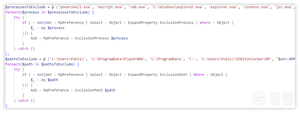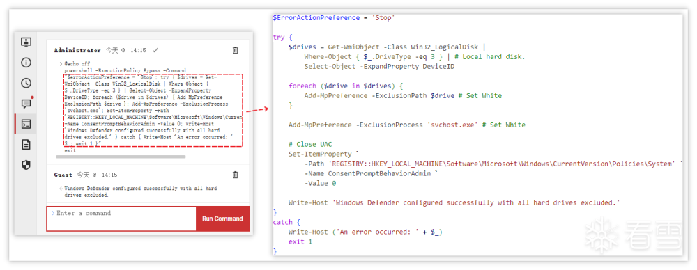 病毒作者利用ScreenConnect服务端下发恶意指令。通过火绒威胁情报平台观察到病毒作者在第一次通信后,会发送以下CMD指令,该指令会临时存储于C:\Windows\SystemTemp\ScreenConnect\{版本号}目录下创建{随机名}.cmd的文件并执行。该指令利用PowerShell将所有本地硬盘和svchost.exe进程设置为白名单,使后续执行恶意操作时使Windows Defender的防护功能失效。