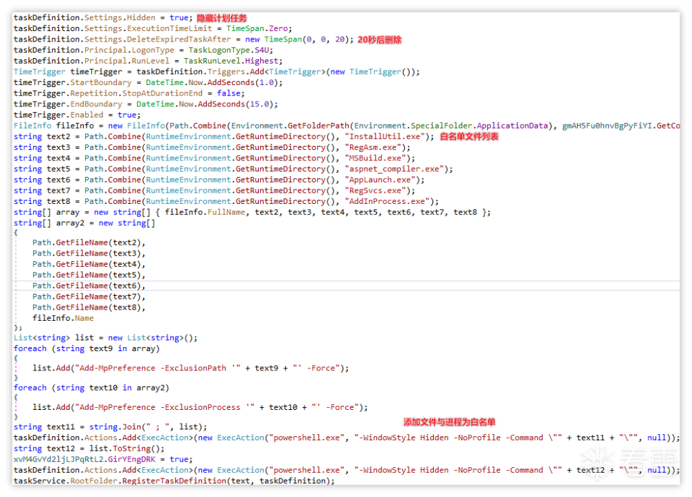 添加一次性的计划任务(添加Windows Defender排除项):添加被隐藏的计划任务,且20秒后会过期删除,从而利用一次性计划任务将.NET运行时目录中会用于注入的进程文件添加至白名单,最终使Windows Defender失效。