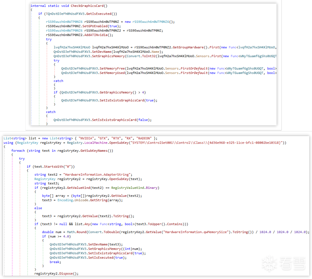 获取显卡信息并选择退出:通过配置数据中的开关选择是否检测显卡信息。获取显卡信息有两种方法,第一个是通过开源项目openhardwaremonitor获取,其中只会获取大于4GB显存的显卡,第二个方法是通过注册表获取包含"NVIDIA","GTX","RTX","RX", "RADEON"等字符串的显卡信息,其中HardwareInformation.qwMemorySize是显存大小,只有大于等于4GB的时候才会获取信息。