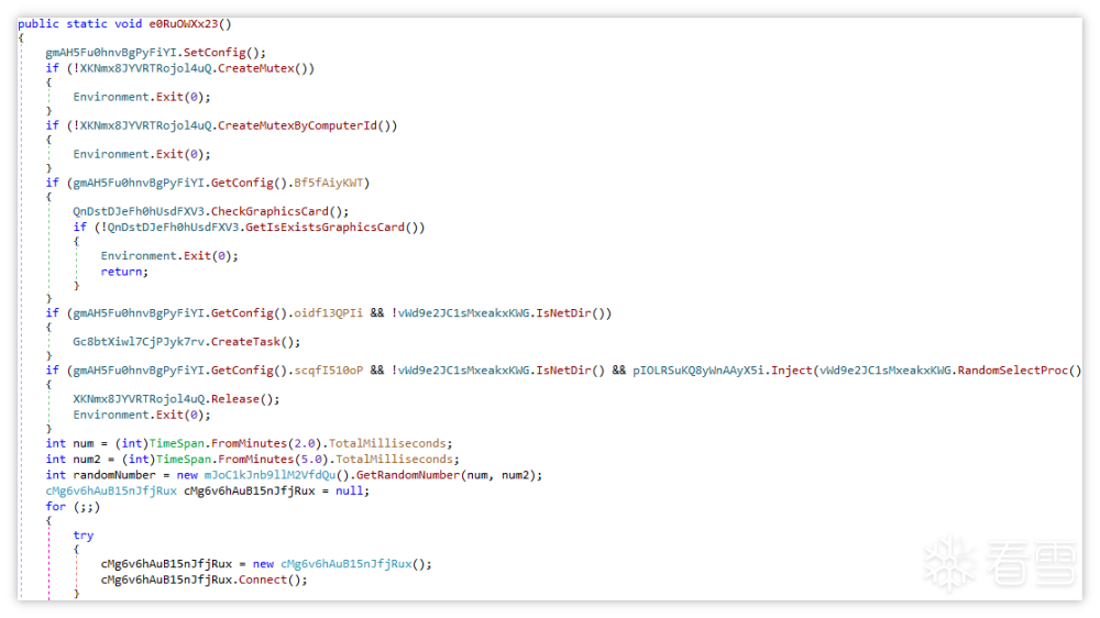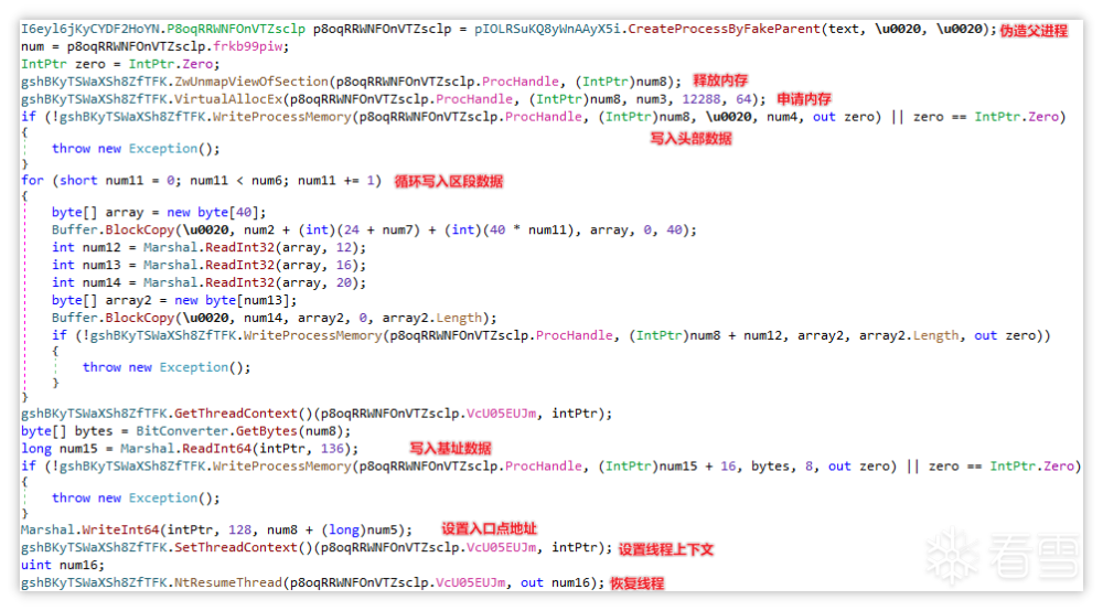 创建傀儡进程并注入:通过配置数据中的开关和是否在.NET运行时目录,从而选择是否注入。其中会将当前进程文件注入到.NET运行时目录中的随机程序进程中("AddInUtil","MSBuild","RegAsm","RegSvcs","aspnet_compiler"),再通过参数创建无窗口(CREATE_NO_WINDOW)与挂起(CREATE_SUSPENDED)的进程。最后通过进程镂空的方式注入,并恢复线程使进程继续运行。