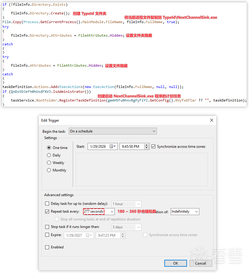 创建反复执行NextChannelSink.exe程序的计划任务:随后再将当前进程文件复制到%AppData%\TypeId\NextChannelSink.exe且设置隐藏。随后创建计划任务使反复执行NextChannelSink.exe程序,其中可以看到实际重复的间隔为277秒(属于随机数)。