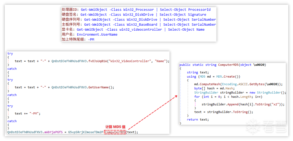 计算用户标识:第二次创建互斥体时的用户标识是利用WMI服务和C#自带的.NETAPI获取到的系统信息组合,计算得出的MD5值。其中系统信息包含处理器、硬盘、主板、显卡相关信息和用户名。