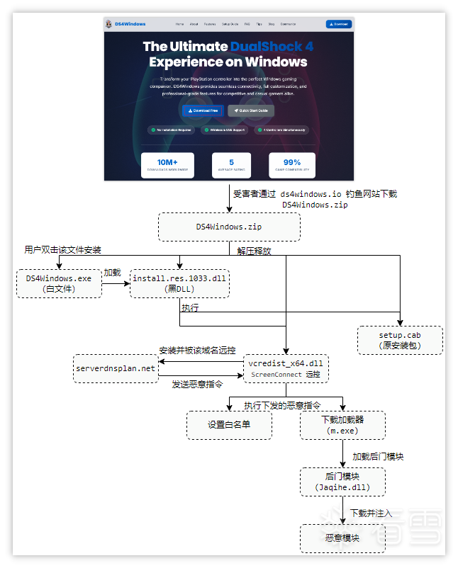 近期,火绒安全工程师在监测网络安全动态过程中,接到用户反馈软件反复报毒的异常情况。经溯源分析与技术研判,确认该问题源于用户从伪装为DS4Windows官方网站的钓鱼站点下载程序,进而导致主机被恶意部署ScreenConnect远程控制工具,遭受持续远程控制。病毒运营者通过该远控工具,向受害主机下发CMD、PowerShell等恶意指令,其中一条指令可诱导受害主机下载并执行C#编写的后门模块。攻击者可依托该后门持续下发任意恶意模块,对受害主机实施信息窃取、勒索攻击等一系列恶意行为。火绒安全产品已可对上述木马程序及相关恶意行为实现精准拦截与全面查杀,切实保障用户设备与数据安全。