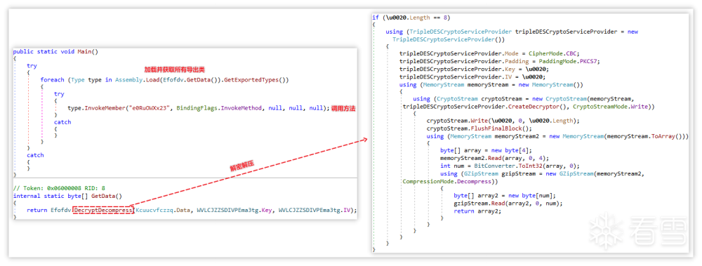 该加载器会通过DES解密和GZip解压缩被加密数据,随后通过遍历所有类并调用类中的方法 e0RuOWXx23,从而调用后门模块的入口点函数。
