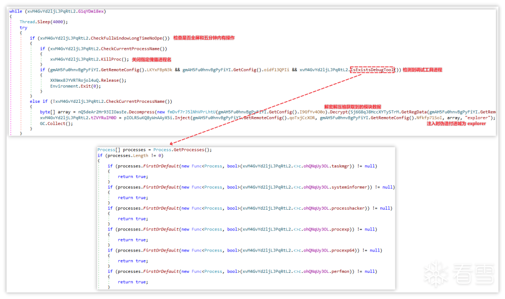 傀儡进程注入恶意模块:若获取到了含有恶意模块下载连接的配置,则会进行下载,并使用同一种方式再次将获取到的恶意模块注入至傀儡进程,并将傀儡进程的父进程伪装成explorer,从而规避EDR的检查。在此之前会检查是否有指定调试工具进程,若有则会直接退出进程。