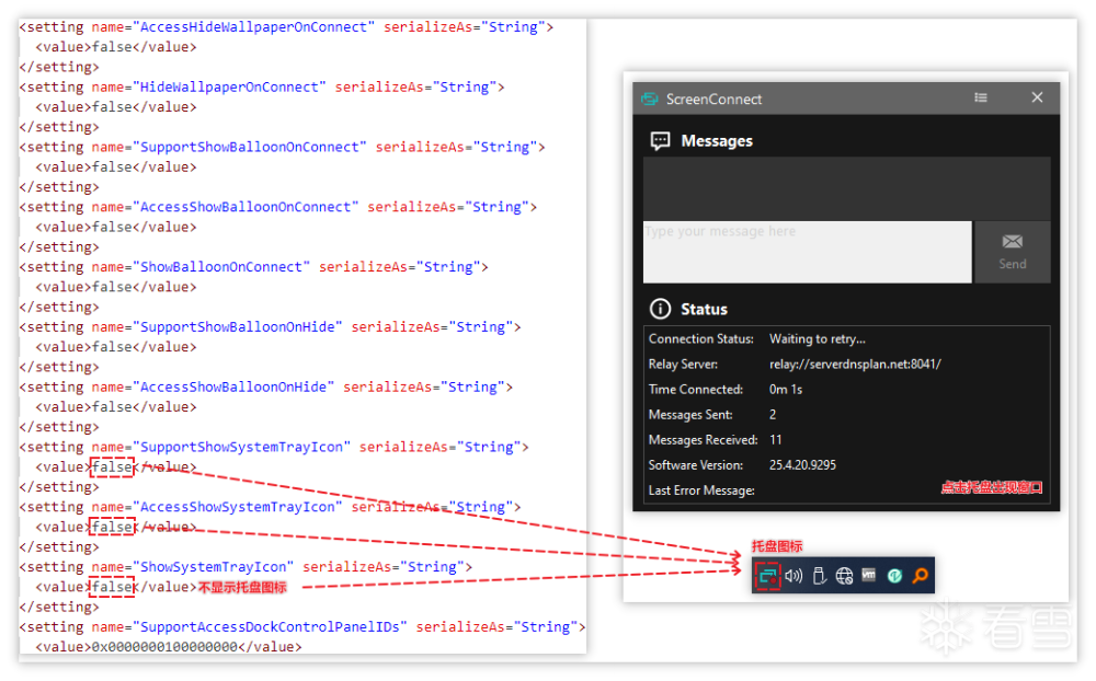 其MSI安装包可根据服务端设置释放app.config配置文件,该文件包含多项可配置的设置项。通过对该文件进行设置,能够使连接提示、气泡、托盘图标、横幅等UI不显示,进而实现静默远控。若未进行设置,则会显示托盘图标以及点击托盘图标后出现的窗口。病毒作者正是利用此配置文件使ScreenConnect远控工具实现静默化,这是ScreenConnect远控工具存在的隐患之一。