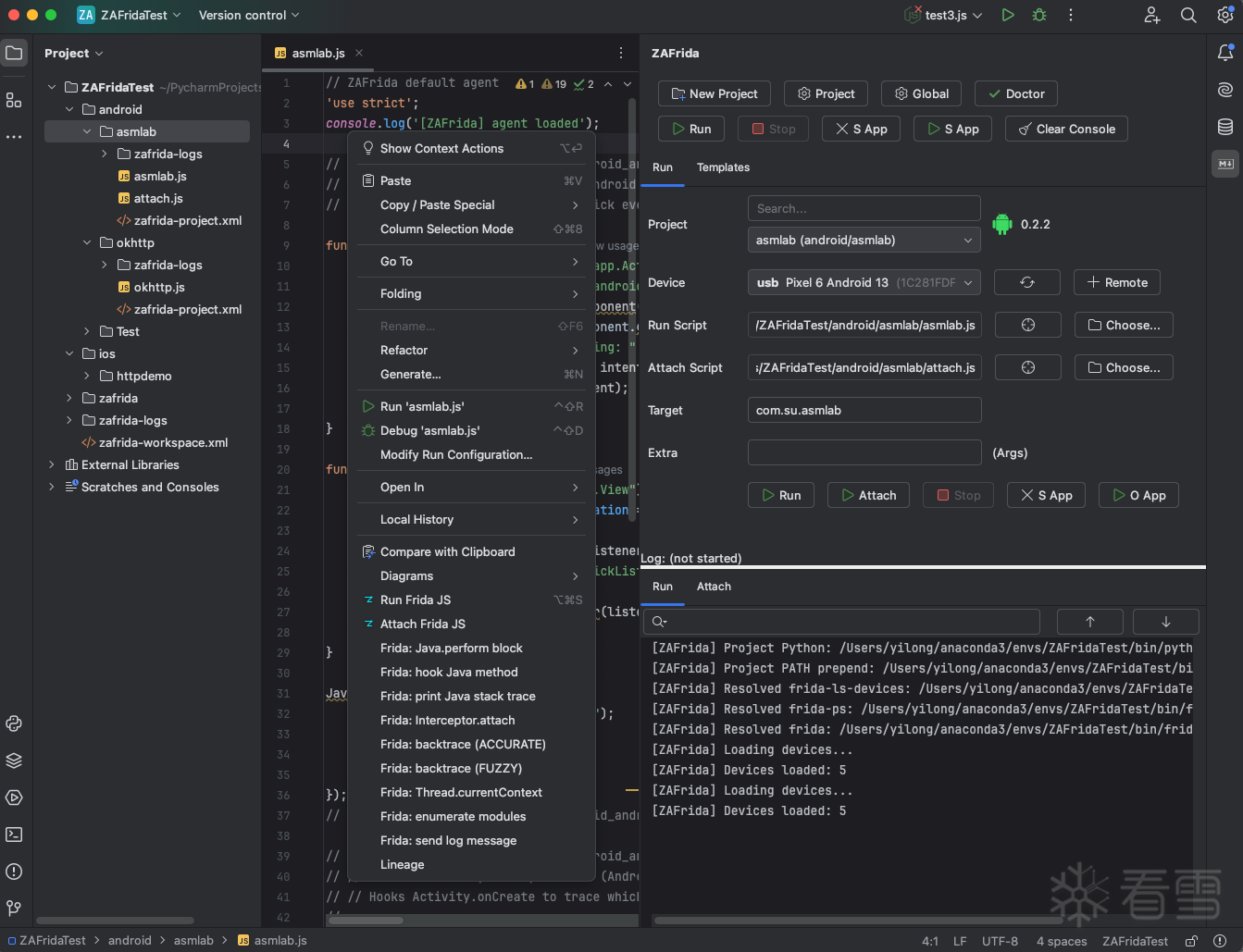 ZAFrida UI 的关键操作:编辑区右键 “Run Frida JS / Attach Frida JS”。