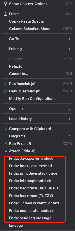 ZAFrida UI 是一个集成在 PyCharm/IntelliJ 的 Frida 图形化插件:你在 JS 编辑区右键就能 Run/Attach 当前脚本,并且会根据脚本所在路径自动切换到对应的 Frida 项目(设备/包名/连接方式/参数);同时提供右键 Snippets 和复选框式模板系统,把 Hook 脚本当“积木”拼。