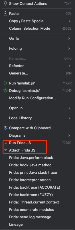 - Run Frida JS:以当前 JS 文件作为主脚本执行(默认 Spawn)。