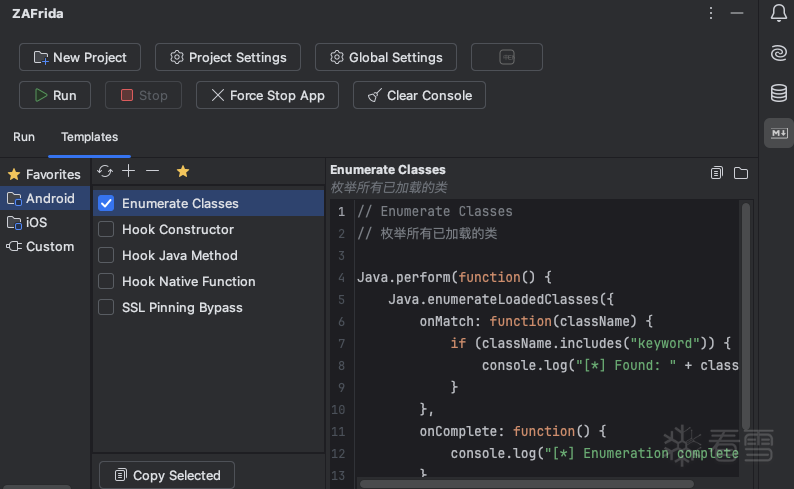内置模板覆盖 Android/iOS 常见场景(例如 SSL Pinning Bypass、Method Hook、Native Hook、FS 监控等)。