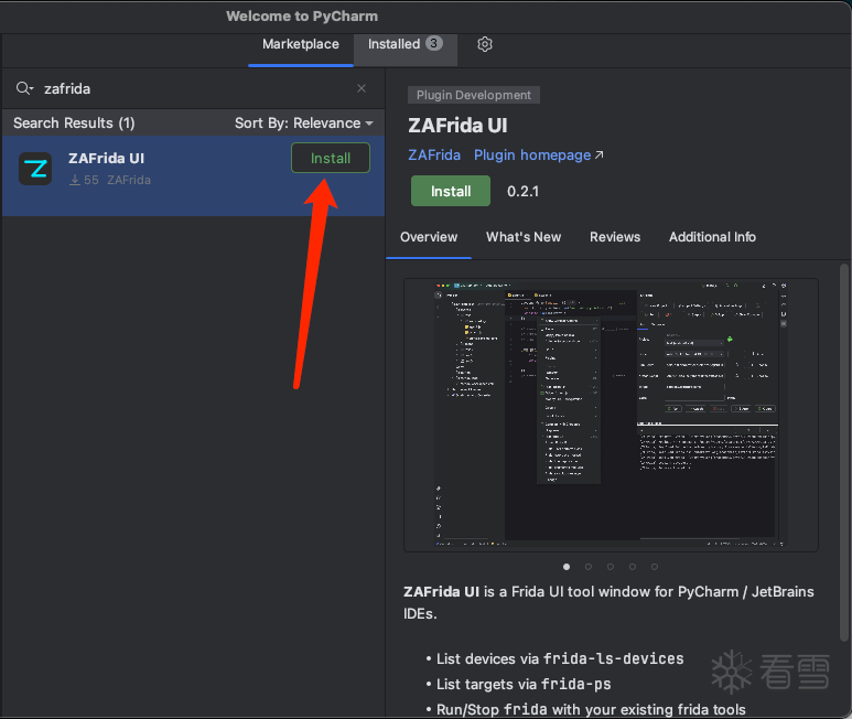 IDE → Plugins → Marketplace → 搜索 ZAFrida → Install → 重启