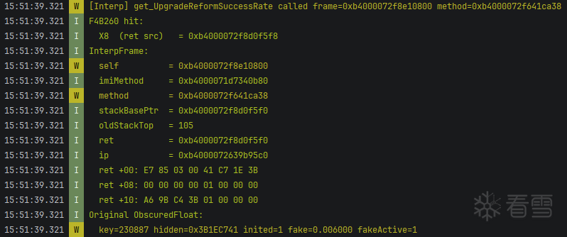 1 2 3 4 5 6 7 8 9 10 11 12 13 14 15 16 17 18 19 20 21 22 | static void on_ret24_cmp(void *address, DobbyRegisterContext *ctx) { uint64_t x8 = ctx->general.regs.x8; InterpFrame* frame = (InterpFrame*)ctx->general.regs.x25; const MethodInfo* method = frame->method->method; const char* name = frame->method->method->name; if (strcmp(name, "get_UpgradeReformSuccessRate") == 0) { LOGI("Original ObscuredFloat:"); LOGW(" key=%d hidden=0x%08X inited=%d fake=%f fakeActive=%d", of->currentCryptoKey, (uint32_t)of->hiddenValue, of->inited, of->fakeValue, of->fakeValueActive); of->fakeValueActive = true; of->Encrypt(0.25f); of->inited = true; LOGI("New ObscuredFloat:"); LOGE(" key=%d hidden=0x%08X inited=%d fake=%f fakeActive=%d", of->currentCryptoKey, (uint32_t)of->hiddenValue, of->inited, of->fakeValue, of->fakeValueActive); }} |