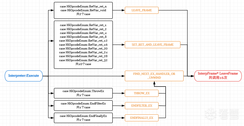 Execute共计调用LeaveFrame16次,与IDA所查看的交叉引用次数相符。此处画一个流程图便于理解: