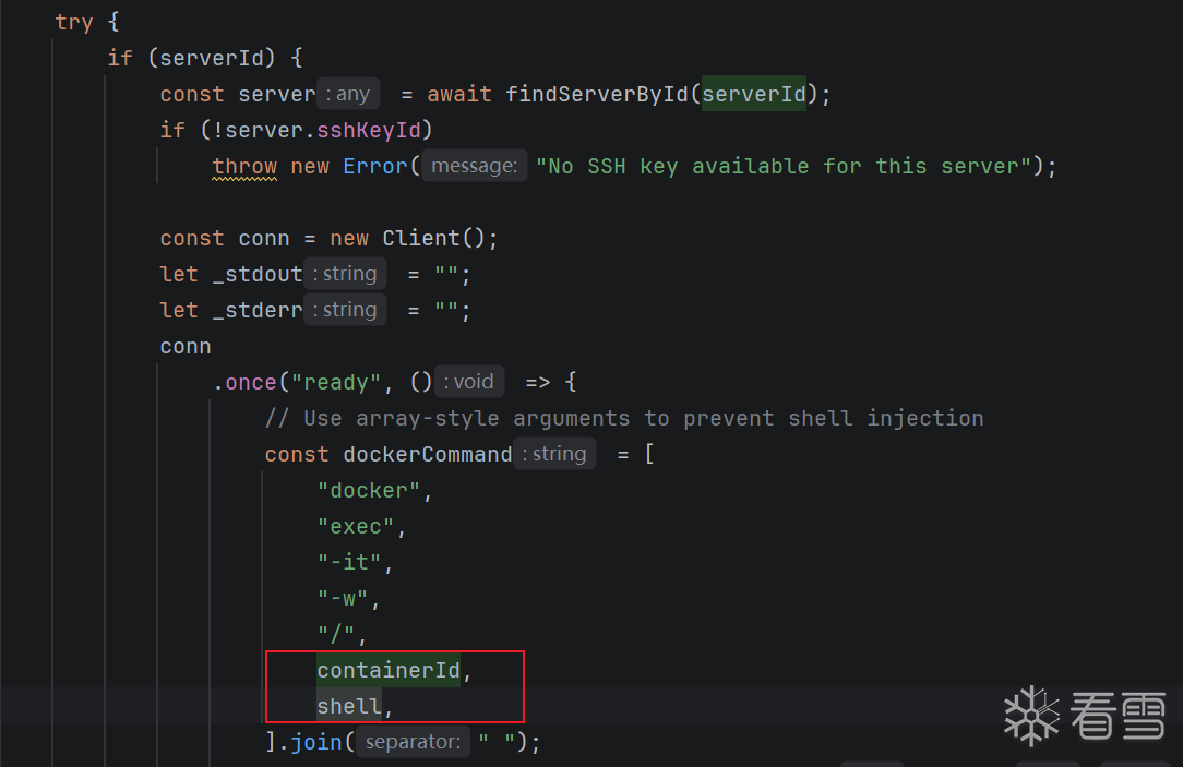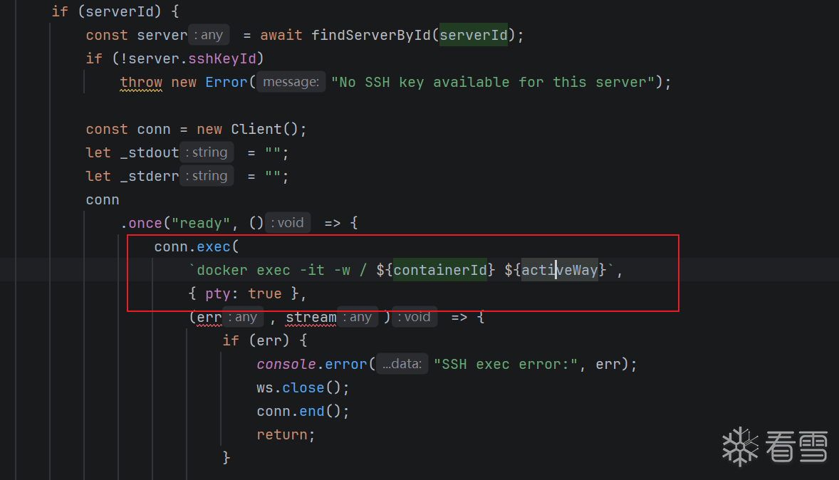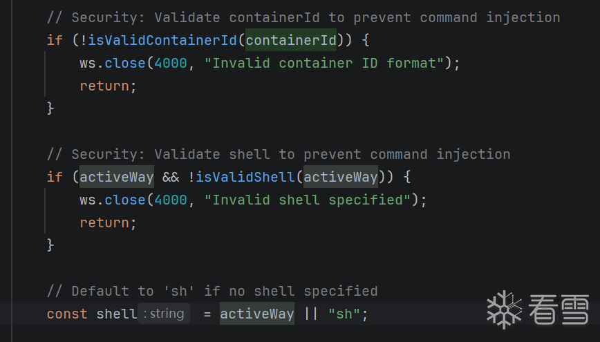 containerId和activeway这两个参数直接拼接到了docker exec 命令中,如果没有针对这两个参数做过滤,就会导致直接拼接攻击者传入的恶意参数(如 ;、&&、|、$( ) 等命令分隔符)造成命令执行漏洞