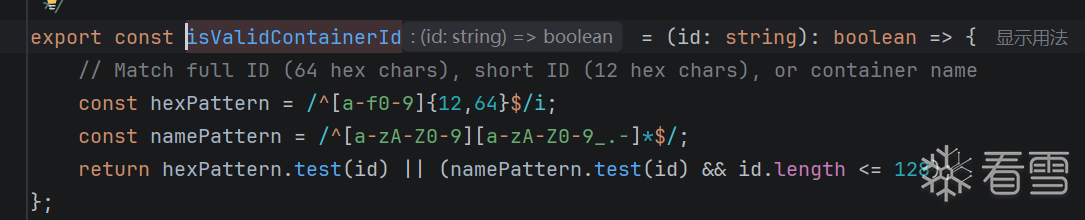 代码通过正则表达式检查三种格式:完整的64位十六进制ID、简短的12位十六进制ID或有效的容器名称(以字母数字开头,包含字母数字下划线点横线,长度不超过128字符)。