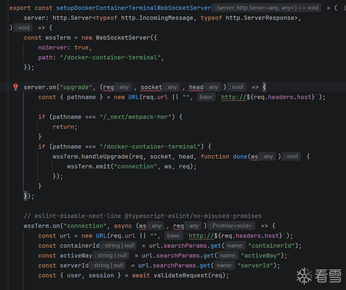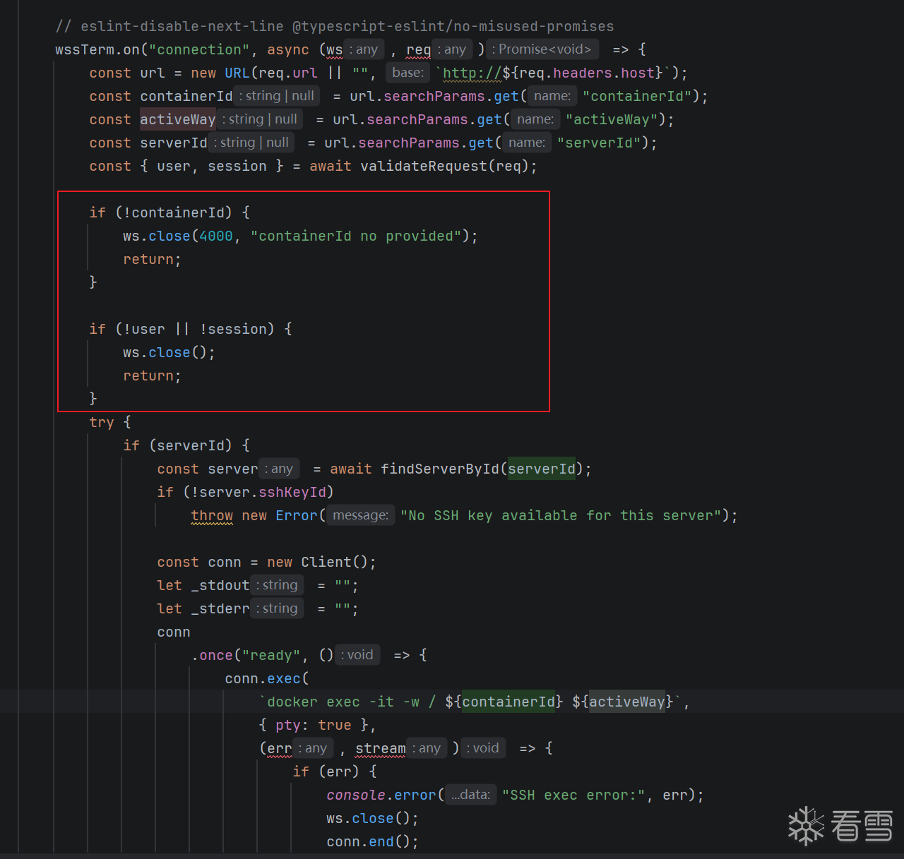 核心漏洞文件:apps/dokploy/server/wss/docker-container-terminal.ts