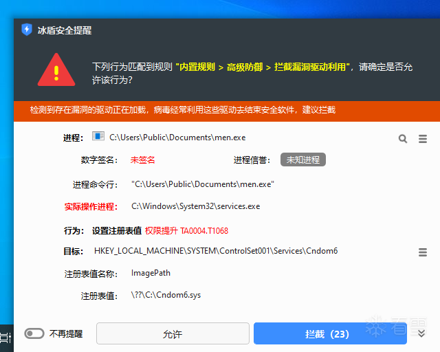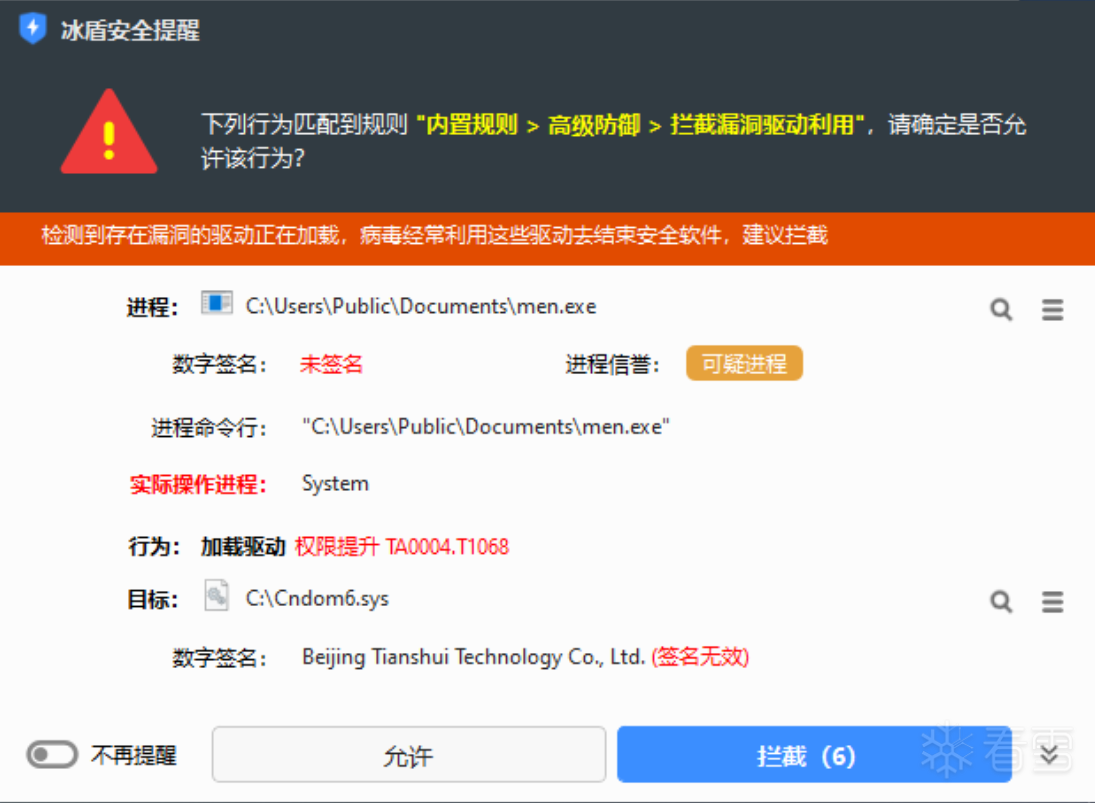 随后,men.exe会释放并加载C:\Cndom6.sys驱动(SHA-256: 8c12407a40eab287a8281be64665b1e72b0e91b2daf84030a1a15dc280e5dbf1; 签名者: "Beijing Tianshui Technology Co., Ltd."),如下图所示: