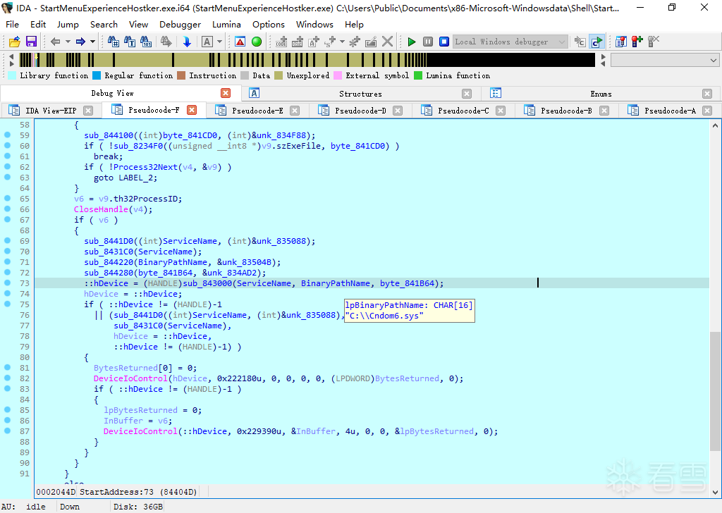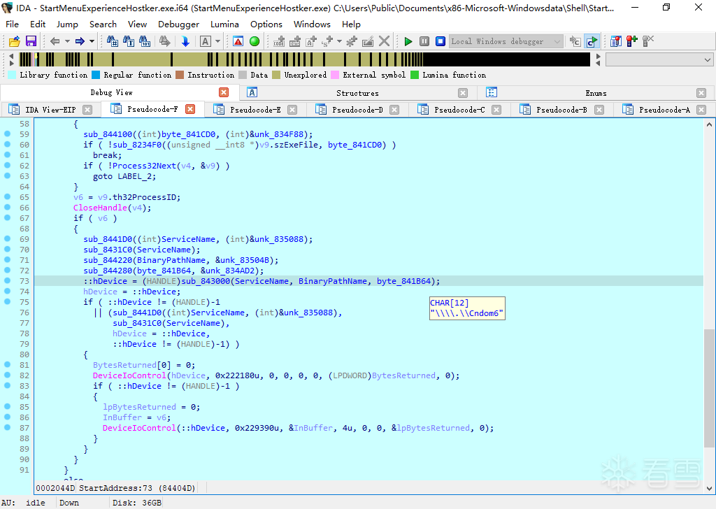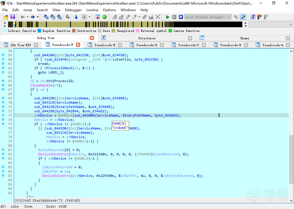 我们从StartMenuExperienceHostker.exe的StartAddress函数中观察到其主要实现两个功能: