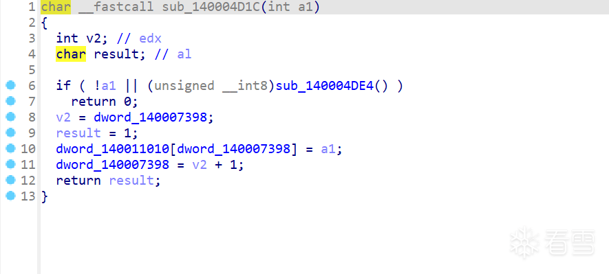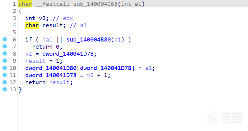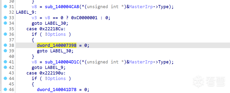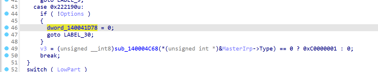 通过交叉引用查找到dword_140041D78标志位由IOCTL 0x222190控制(本次样本未发送),由sub_140004C68进行赋值,如下图所示: