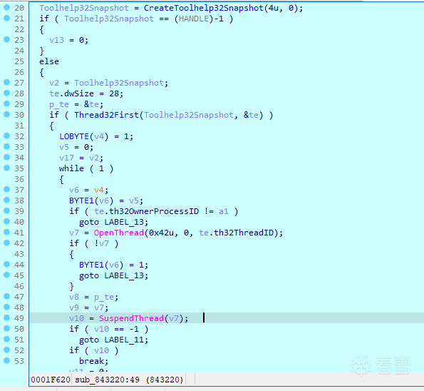 随后先调用sub_843220(th32ProcessID),通过SuspendThread(Win32 API)函数挂起其进程中的所有线程(下方还有错误处理未展示:如果线程挂起失败或原本已被挂起,则立即恢复线程原先状态,避免重复挂起),如下图所示: