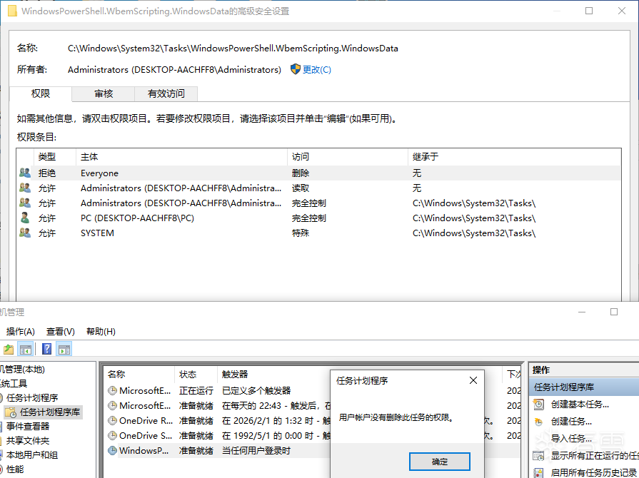 且样本会更改其对应计划任务xml文件C:\Windows\System32\Tasks\WindowsPowerShell.WbemScripting.WindowsData对象的DACL,导致系统在尝试删除该条计划任务时,因权限不足无法删除此条计划任务,如下图所示: