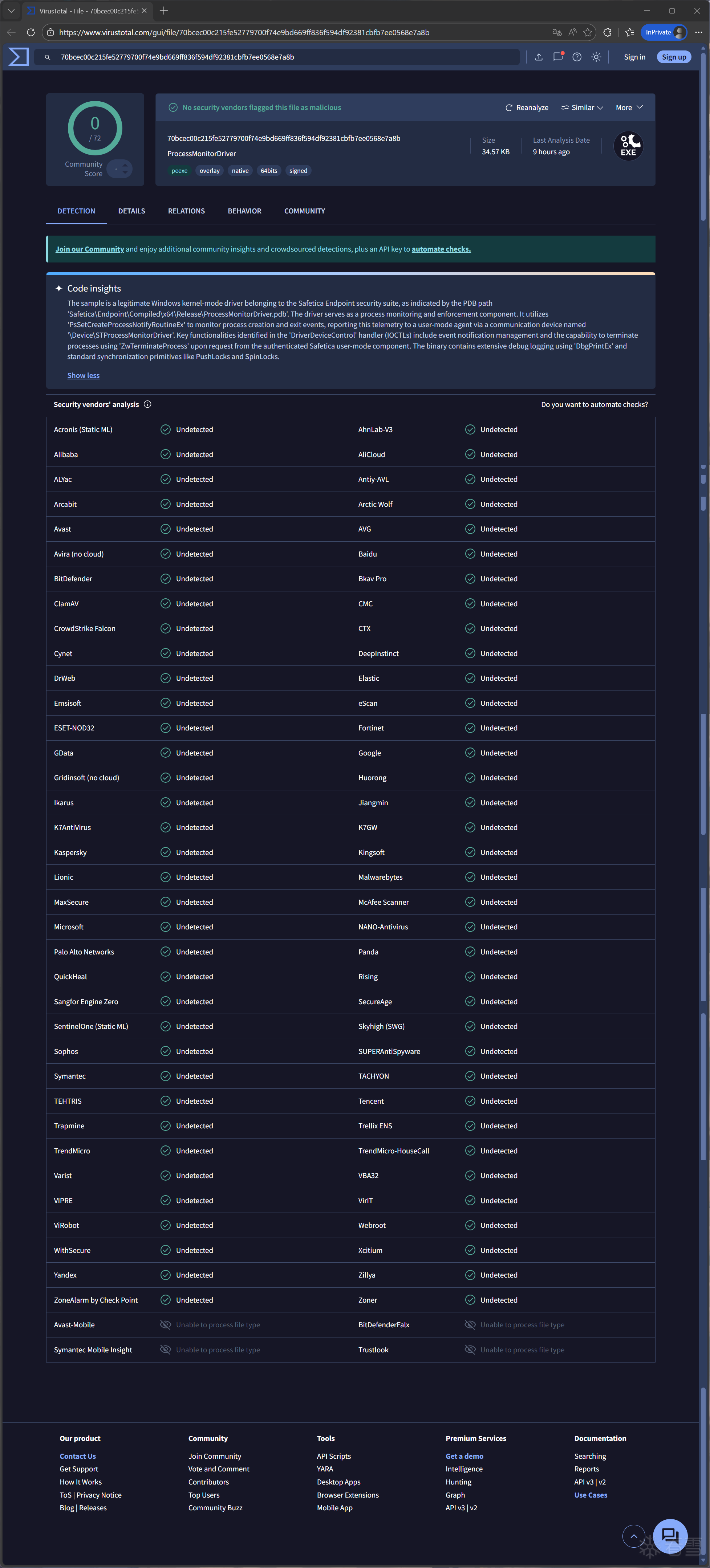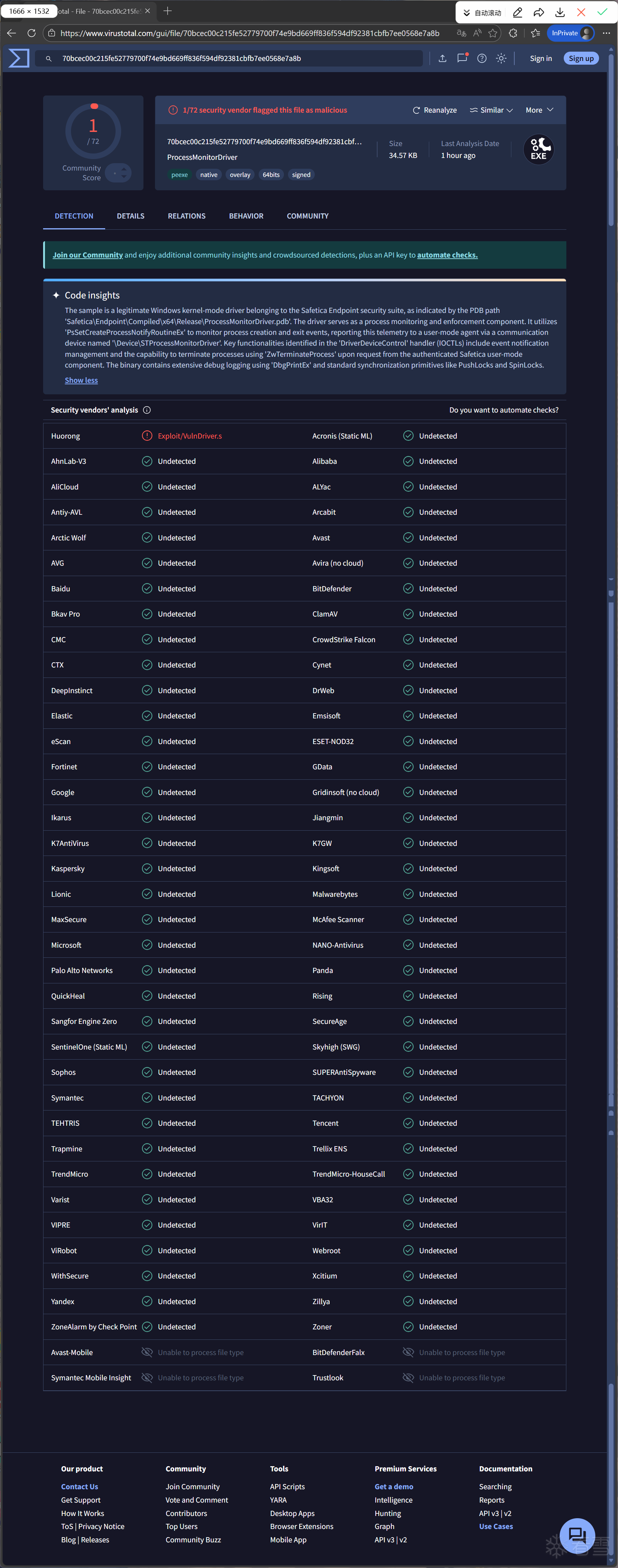 在样本发现时,在VirusTotal上该脆弱驱动程序尚未被安全产品标记,截至本文撰稿前被一家安全产品标记,如下图所示: