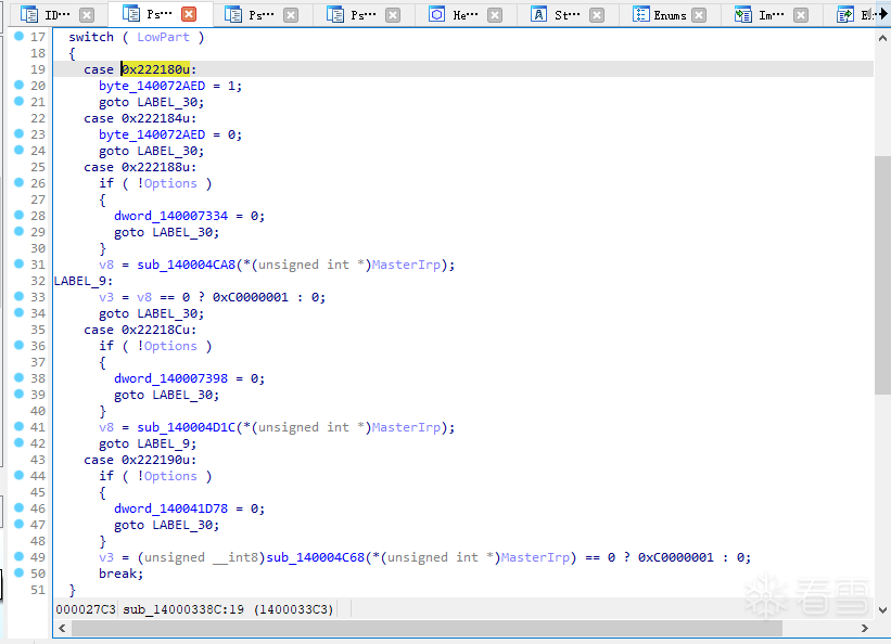 在sub_14000338C中,我们看到case 0x222180的主要操作是将byte_140072AED标志位设置为1,如下图所示: