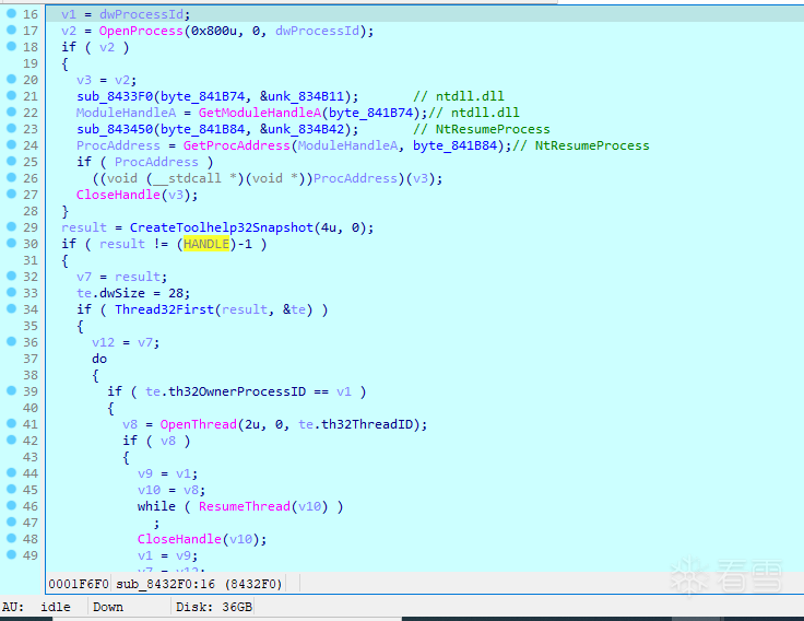 然后再调用sub_8432F0(th32ProcessID),通过GetProcAddress(GetModuleHandleA("ntdll.dll"), "NtResumeProcess")方式从ntdll.dll中动态获取NtResumeProcess(NT API)函数,如果成功则调用NtResumeProcess函数恢复其进程中的所有线程,之后再次尝试通过ResumeThread(Win32 API)函数恢复其进程中的所有线程,如下图所示: