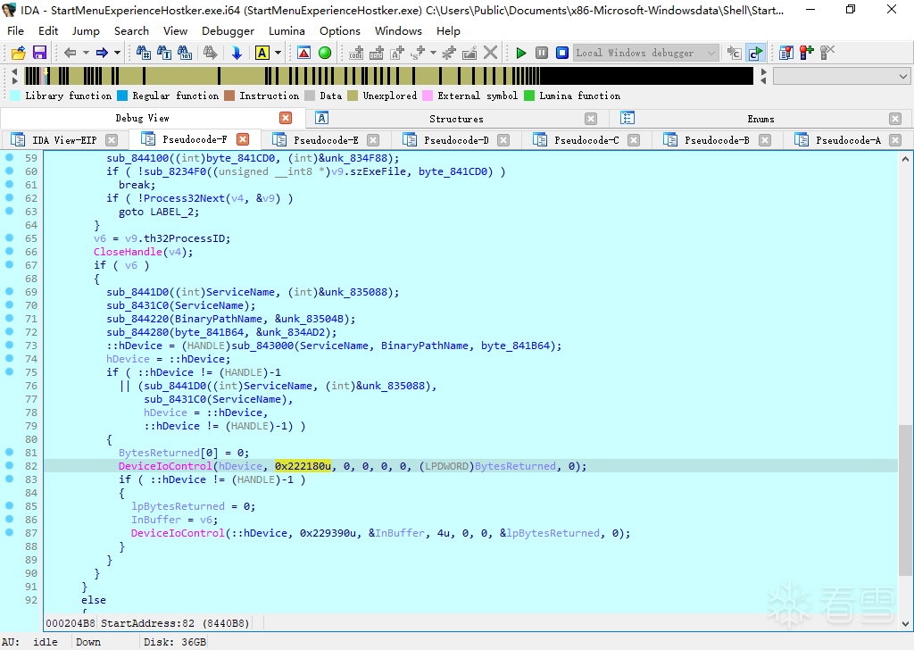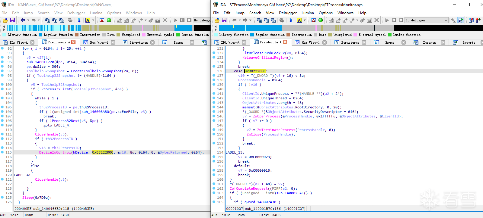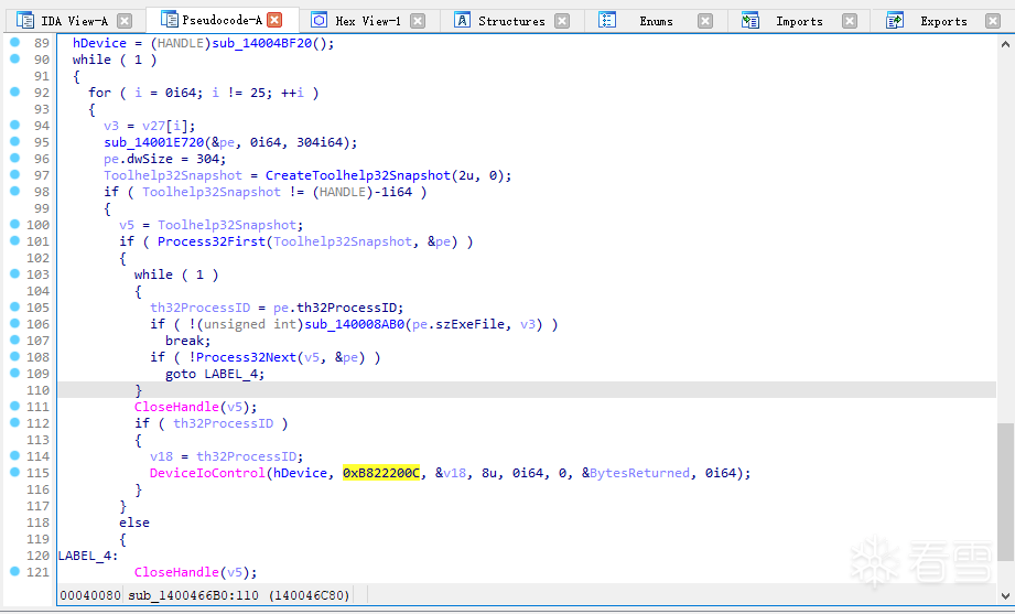 然后不断遍历进程、获取指定进程PID (th32ProcessID、v16为进程PID指针),在Line 111通过DeviceIoControl向该设备发送控制码0xB822200C与进程PID(&v16)