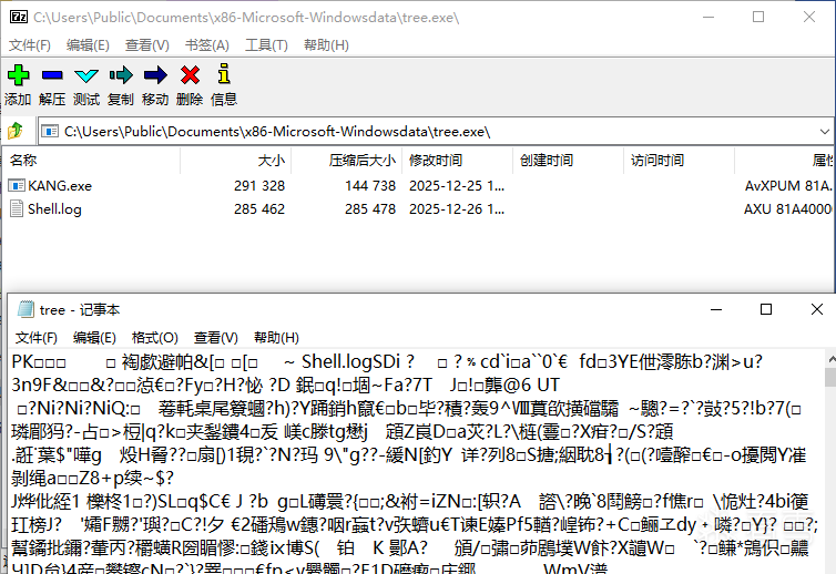 根据文件头信息 tree.exe实际为Zip加密压缩包,解压后可得到: KANG.exe Shell.log,如下图所示: