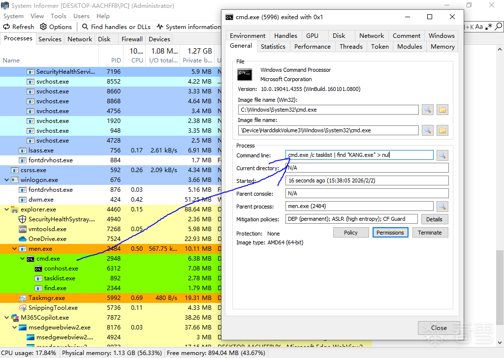 随后men.exe会寻找判断KANG.exe是否已经启动,并不断拉起KANG.exe,如下图所示: