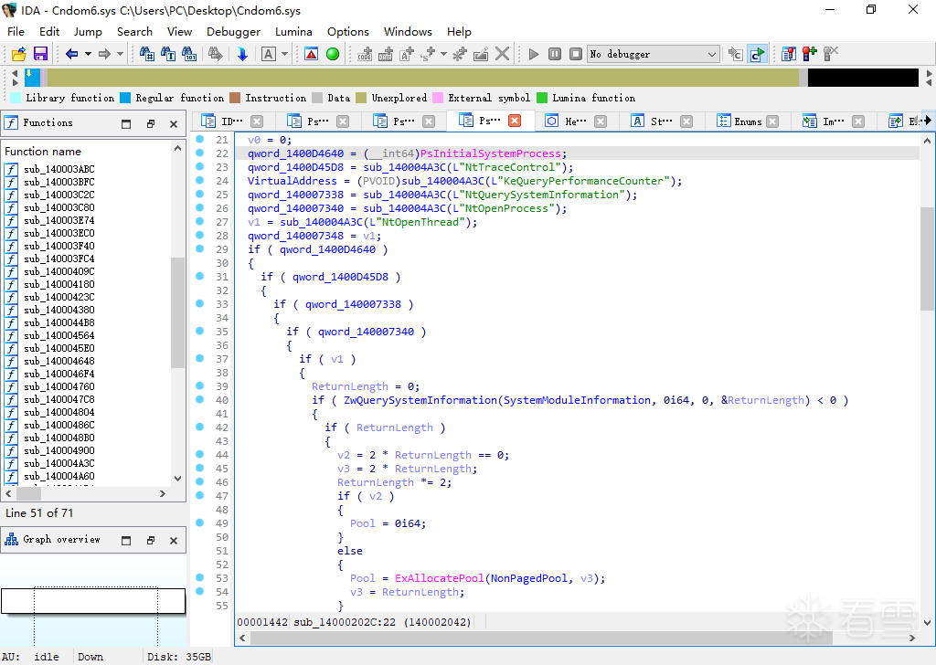 重新回头看该驱动具备的其他功能,从DriverEntry=>if ( sub_140001A10() )=>if ( ... && sub_14000202C() )中,发现该驱动通过调用sub_140004A3C函数获取NtTraceControl、KeQueryPerformanceCounter、NtQuerySystemInformation、NtOpenProcess、NtOpenThread等内核API地址,如下图所示: