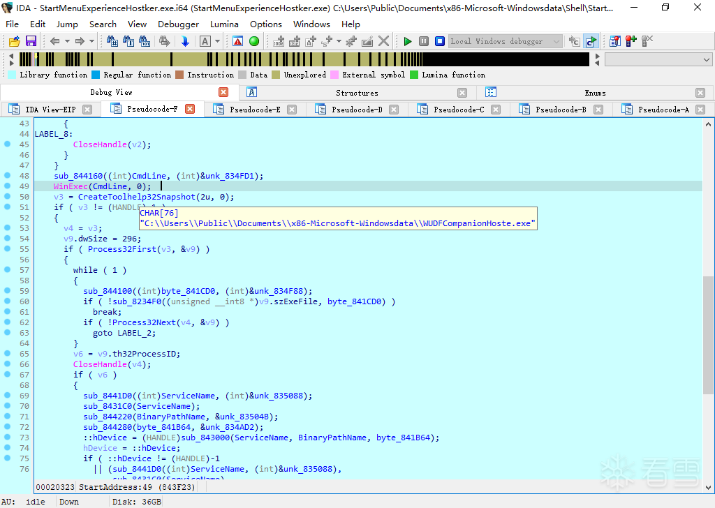 完成上述步骤后,将WUDFCompanionHoste.exe文件路径赋给CmdLine,使用WinExec(CmdLine, 0)重新再次启动WUDFCompanionHoste.exe,如下图所示: