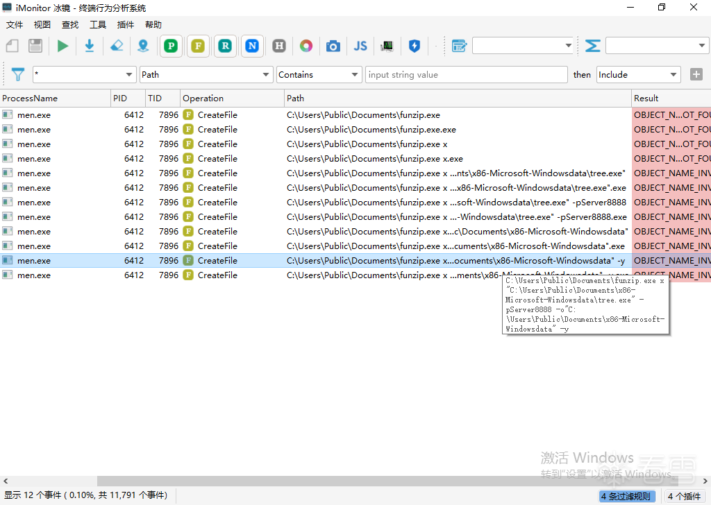 拉起的funzip.exe进程命令行为: C:\Users\Public\Documents\funzip.exe x "C:\Users\Public\Documents\x86-Microsoft-Windowsdata\tree.exe" -pServer8888 -o"C:\Users\Public\Documents\x86-Microsoft-Windowsdata" -y,即将tree.exe解压至x86-Microsoft-Windowsdata目录下,解压密码为"Server8888",如下图所示: