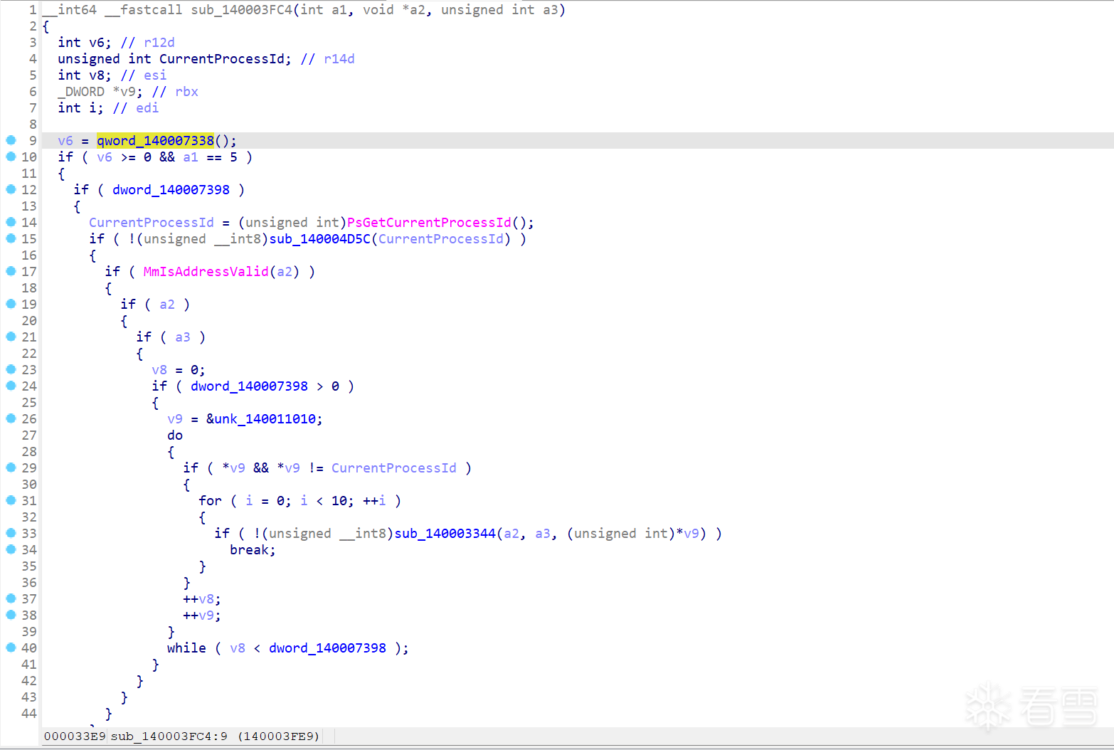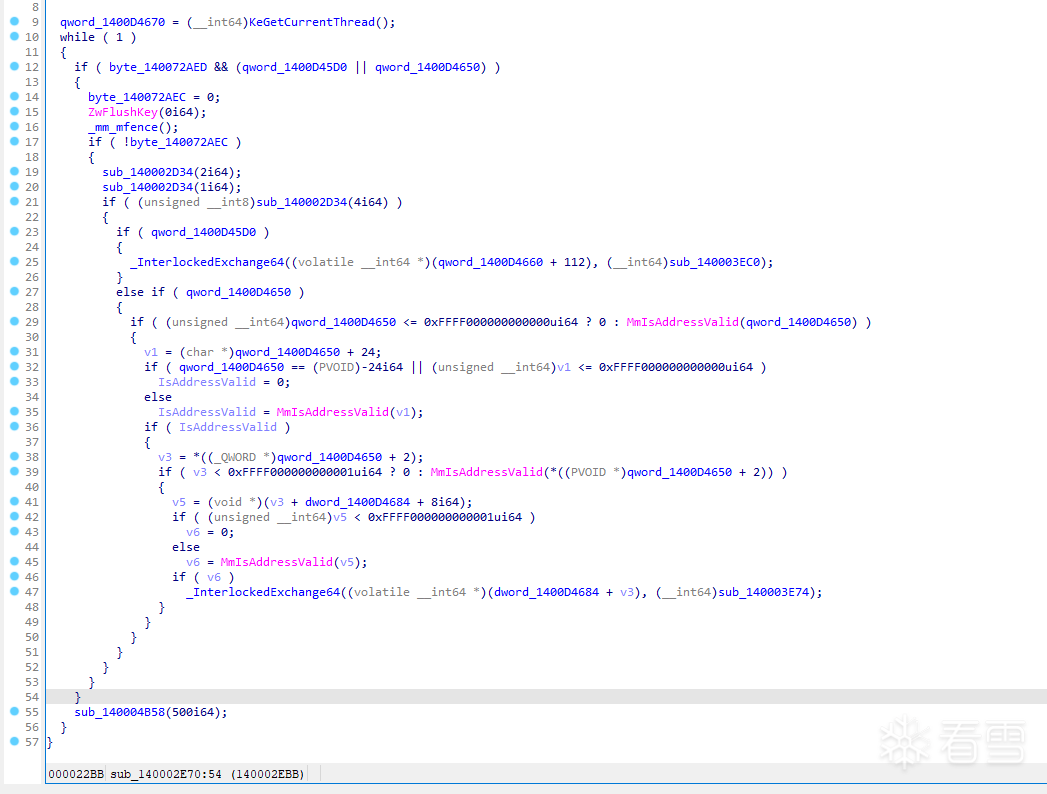 我们查看该标志位的交叉引用,发现有函数会在判断该标志位是否有效后,动态替换函数指针实现系统内核函数Hook,可能用于处理KeGetCurrentThread,用于执行线程隐藏或保护线程执行信息,如下图所示: