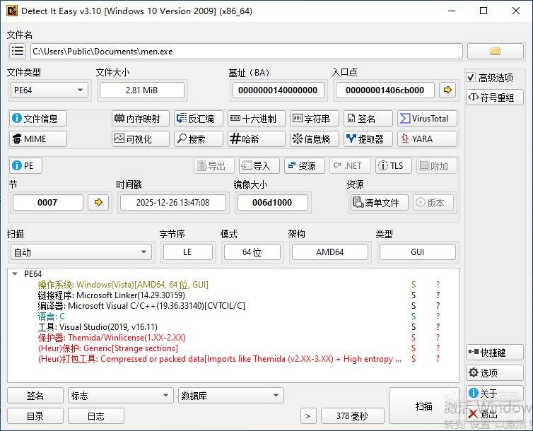 该程序使用Themida保护器加壳,如下图所示: