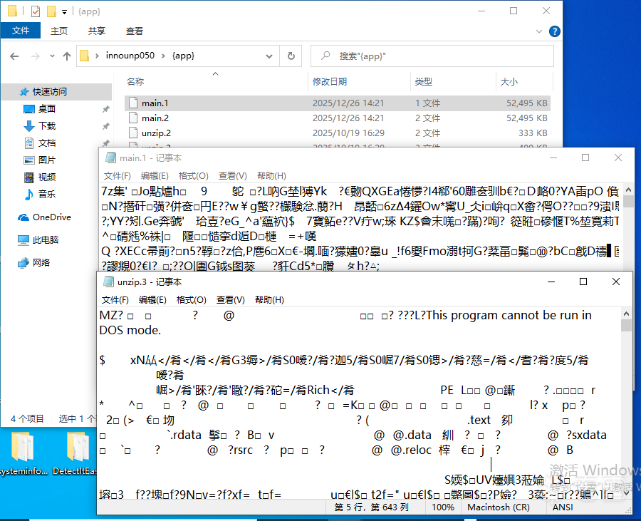 其中,main.1具有7-Zip压缩包文件头,但单文件并不完整;unzip.3具有MZ头和PE头,但单文件并不完整。
