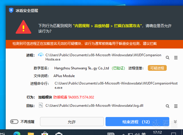 这是一组dll劫持/dll侧载/白加黑,WUDFCompanionHoste.exe启动后会尝试加载log.dll中的代码,如下图所示:
